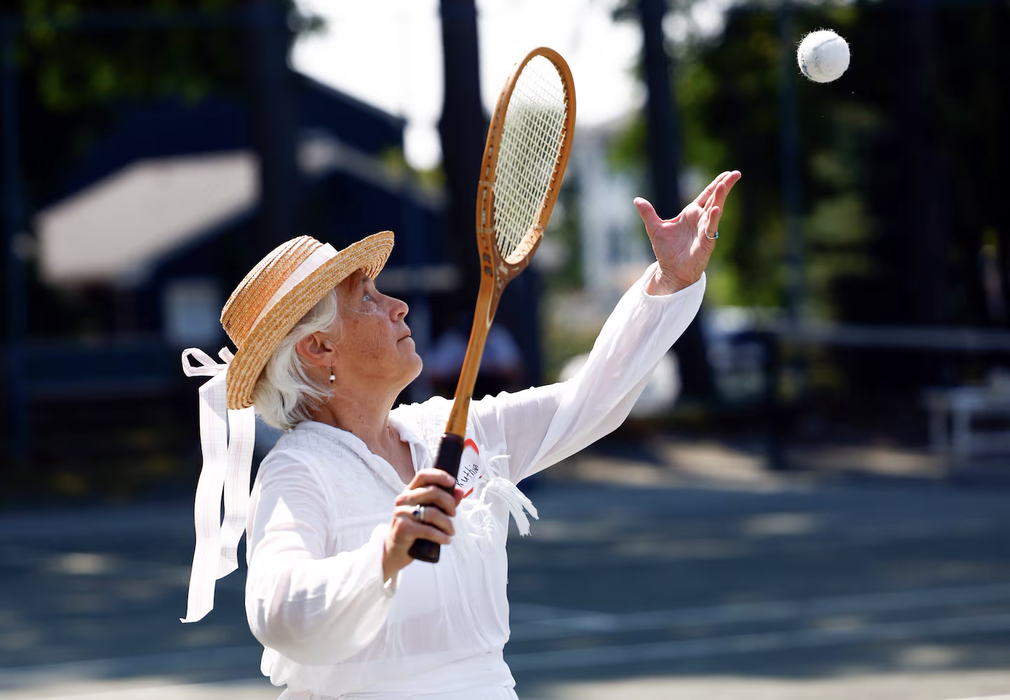 Participants wore attire that suited the style from a century and a half ago and used wooden racquets, hitting white tennis balls.