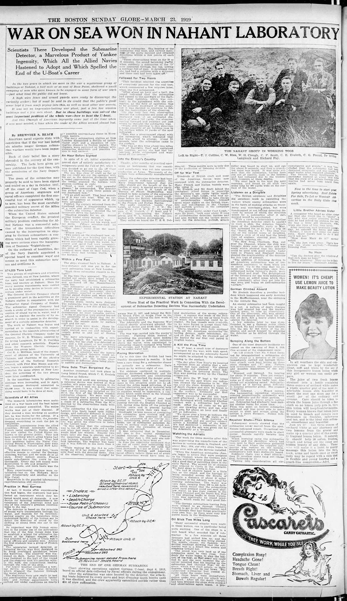 The hydrophone was developed not a moment too soon. German U-boats began appearing all along the U.S. east coast. The newly trained, and numerous, anti-submarine forces were put into action, some of them having been trained in Nahant.